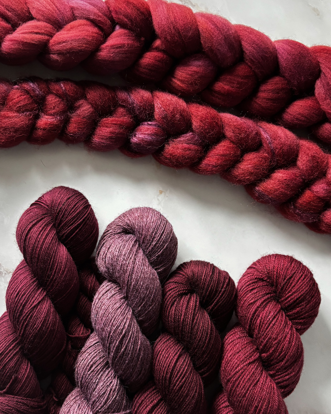 **In order to cut back on waste, we've dyed up Simply DK to represent Simply Fingering, Simply Sport, Simply DK, and Simply Worsted rather than dyeing up samples of each weight. The same goes for NSW DK (representing NSW Fingering, NSW Sport, NSW DK, and NSW Worsted). These bases dye up similarly if not the same as the other weights in their base family (Simply being all superwash merino, NSW being nonsuperwash merino, and Woolen being a nonsuperwash woolen spun merino)