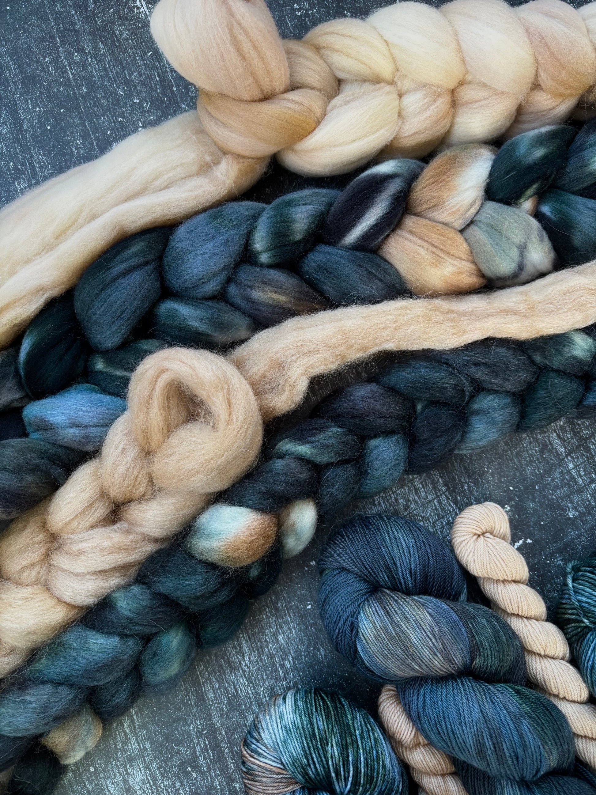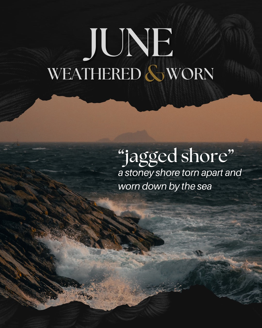 Shop extras from June’s installment of the Weathered and Worn mystery yarn/fiber club. This month's colorway, "Jagged Shore" is inspired by a stoney shore, torn apart and worn down by the sea. Dark charcoal, deep sea teal with splashes of light blue and white from tossed water, and touches of blush from the sunset.